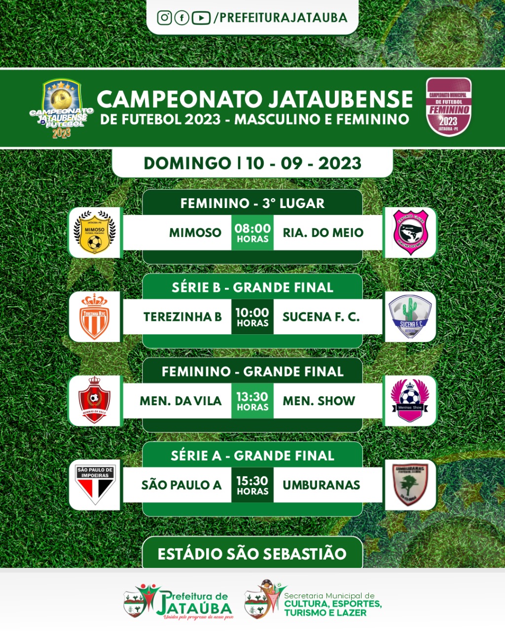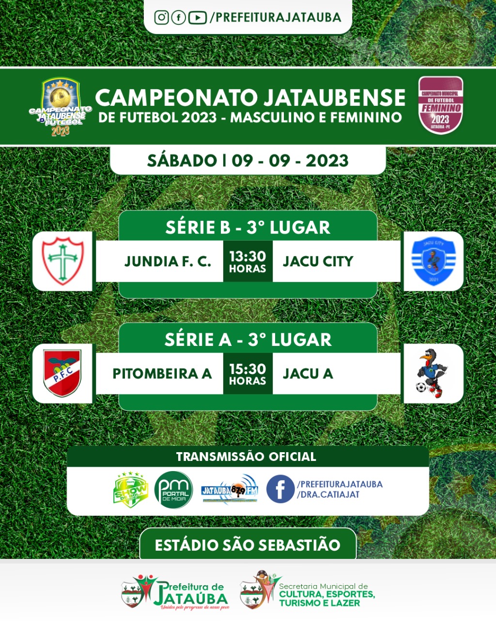 Todos os jogos acontecerão no Estádio São Sebastião, e serão transmitidos Ao Vivo pela Equipe Show de Bola, através do Portal de Mídia, Rádio Jataúba FM e pelos facebooks da Prefeitura e da Prefeita Drª Cátia Ribeiro.