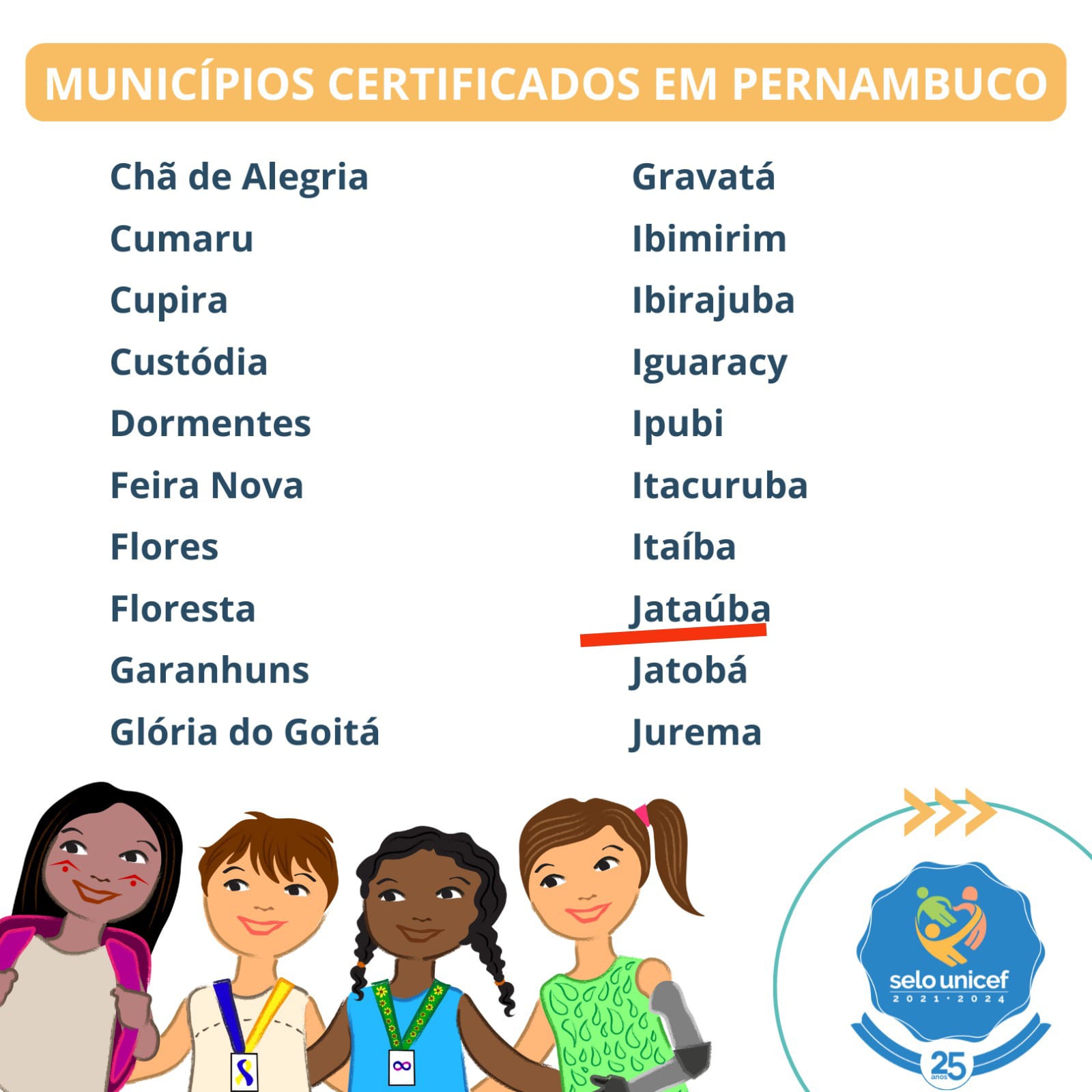 Através de um trabalho intersetorial onde as secretarias municipais de Educação, Saúde e Ação Social alcançaram as metas exigidas na garantia de direitos das crianças e adolescentes do município, a Prefeitura de Jataúba, pela primeira vez na sua história, recebe a certificação do Selo UNICEF na edição de 2021/2024.