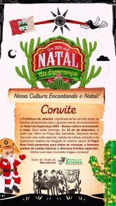 A Prefeitura de Jataúba orgulhosamente convida todas as famílias jataubenses para o grande evento de encerramento do Natal da Esperança 2024 – Nossa cultura encantando o natal.