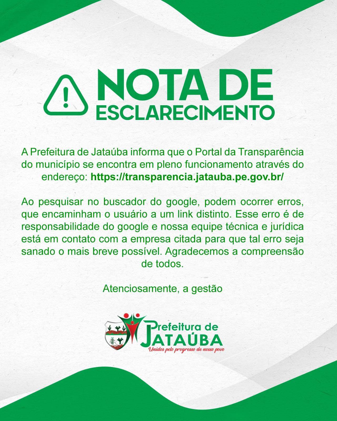 A Prefeitura de Jataúba informa que o Portal da Transparência do município se encontra em pleno funcionamento através do endereço: https://transparencia.jatauba.pe.gov.br/