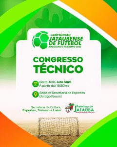 Campeonato Jataubense de Futebol 2025 Campeonato Jataubense de Futebol 2025 ⚽🏟🥅 O maior campeonato de futebol de campo está voltando, e o congresso técnico acontecerá nesta sexta, dia 4 de abril, ás 18:30hrs na secretaria de esportes (prédio do antigo fórum). Total de visitas na página: 253 Alicia Rafaely da Silva Oliveira 2025-04-01T11:07:18+00:00 Abril 1, 2025| Compartilhe esta história, escolha sua plataforma! FacebookTwitterLinkedinRedditTumblrGoogle+PinterestVkEmailWhatsapp Posts Relacionados RESULTADO FINAL – SELEÇÃO RESULTADO FINAL – SELEÇÃO RESULTADO PRELIMINAR – ENTREVISTA – 2ª ETAPA RESULTADO PRELIMINAR – ENTREVISTA – 2ª ETAPA 4º Mutirão de Cadastramento Biométrico em Jataúba 4º Mutirão de Cadastramento Biométrico em Jataúba Resultado 1ª Etapa SELEÇÃO PARA COMPOSIÇÃO DE CADASTRO DE FORMADORES MUNICIPAIS NO ÂMBITO DO PROGRAMA CRIANÇA ALFABETIZADA Resultado 1ª Etapa SELEÇÃO PARA COMPOSIÇÃO DE CADASTRO DE FORMADORES MUNICIPAIS NO ÂMBITO DO PROGRAMA CRIANÇA ALFABETIZADA