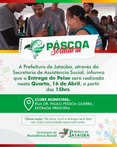 A Prefeitura de Jataúba, através da Secretaria de Assistência Social, informa que a Entrega do Peixe será realizada nesta Quarta, 16 de Abril, a partir das 15hrs.