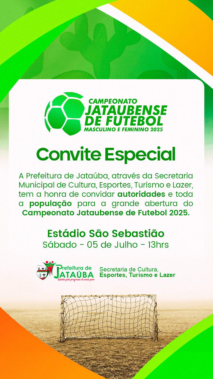 A Prefeitura de Jataúba, através da Secretaria Municipal de Cultura, Esportes, Turismo e Lazer, tem a honra de convidar autoridades e toda a população para a grande abertura do Campeonato Jataubense de Futebol 2025.